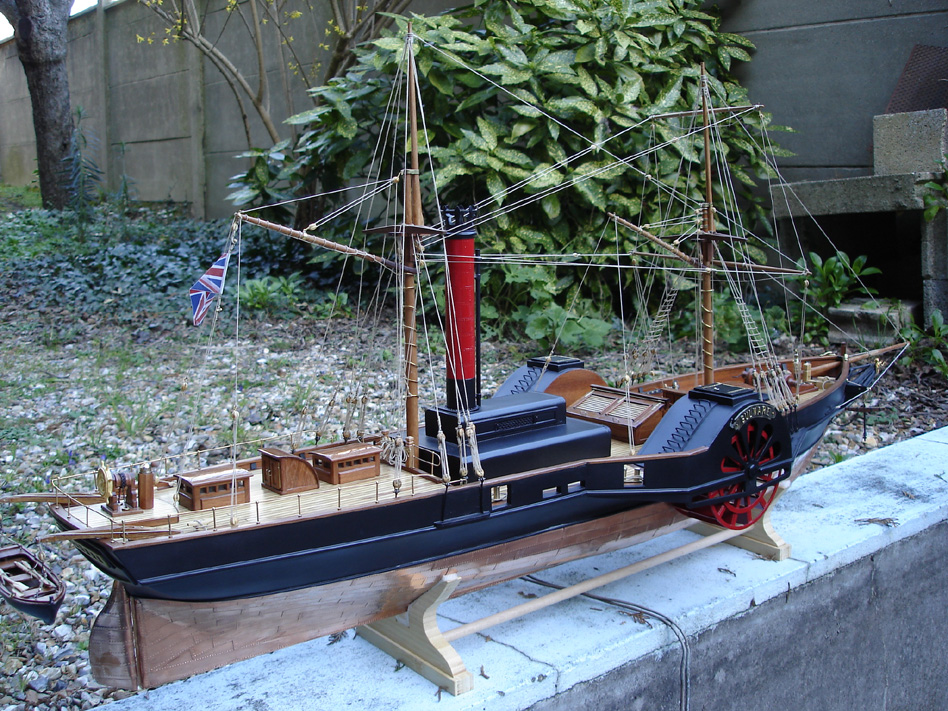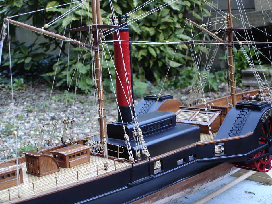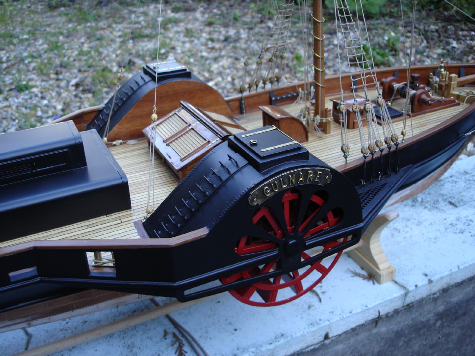‘’ GULNARE ‘’ Echelle 1/40éme— Cette frégate mixte voile et vapeur, à roues à aubes, a été construite de 1832 à 1834 en Angleterre, pour la marine Sarde (transport de passagers et transports militaires), puis utilisée par la marine Italienne à partir de 1861 (liaison postale Ile d’Elbe). Elle fut désarmée en 1875.— Caractéristiques techniques.— Longueur 43,20— Largeur 12 ,160 m— Tirant d’eau 3,2 m— Déplacement 310 tonnes— Vitesse 7 noeuds— Puissance 1 moteur 2 cylindres de 90 CV— / Equipage 57 membres—