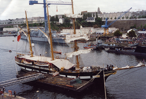 Réalisé dans le chantier naval de Nantes ( sur des plans de St Malo) il fut inauguré en 1934 par une société privée pour la pêche et le transport du merlan dans le banc de Terre-neuve. En 1951 il fût acheté par le gouvernement italien pour être associé à l’Amerigo Vespucci dans le rôle de Navire Ecole sous-officier. Après l’acquisition il fût envoyé pour travaux de transformation au chantier naval de Castellamare di Stabia et ensuite à l’arsenal de La Spezia. Il entrera en service le 16 juillet 1955 Rebaptisé Palinuro en honneur du mythique navigateur d’Enee dans l’Enéide de Virgile. Le navire à une superficie de voile d’environ 1000 mq. Son activité de navire Ecole touche les majeurs ports de la méditerranée et du Nord Europe. —-Tipe Voilier—- Chantier Nantes—- Construction 1934—- En service pour la marine italienne 16 juillet 1955— Poids 1.341 T— Longueur 69 m— Largeur 10 m Tiran d’Eau 4.8 Vitesse 10 Noeuds